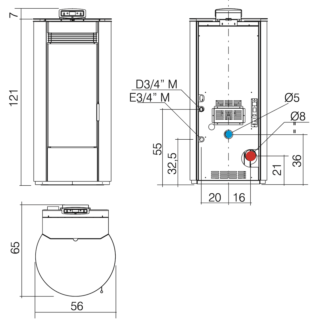 - Uscita fumi: Ø 8 cm posteriore, maschio
